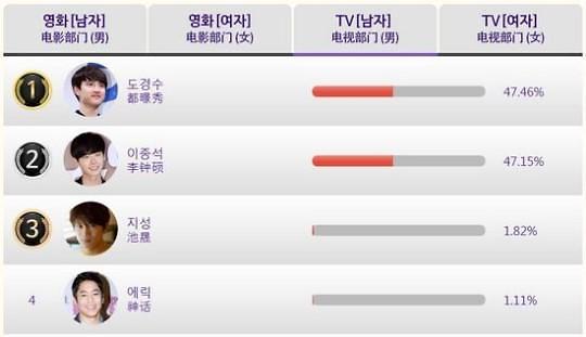 另外,在电影部门“最佳人气男演员奖”,凭借电影《江南1970》入围的人气男星李敏镐以53.1%的得票率位居榜首;紧随其后的是凭借电影《海雾》入围的JYJ成员朴有天,得票率为43.25%。