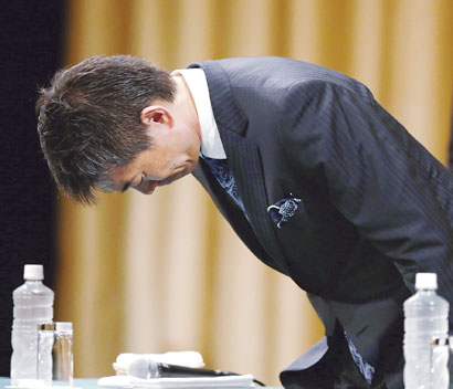 图片说明:桥下彻在新闻发布会上鞠躬,由于“大阪都构想”遭到否决,他将履行承诺,在今年12月任期结束后退出政坛。 东方IC