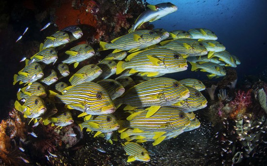 印度尼西亚四国群岛中围岛(Wai Island)的多纹石鲈鱼群。