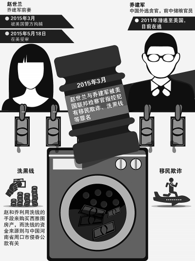 美国联邦检察官对乔建军和赵世兰提出了移民欺诈、转移偷盗所得财产、洗钱等多项罪名指控。赵世兰于今年3月在华盛顿州被捕,目前已交付25万美元现金取保候审。同案犯、携数亿元人民币赃款潜逃美国的前中国储备粮管理总公司河南周口直属库主任乔建军依然在逃。