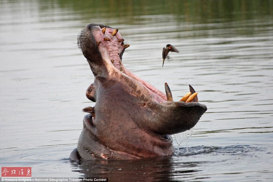 亲密接触:一只啄牛鸟在前往栖息地时正好一头河马张开大嘴。小鸟差点儿没被大嘴给吸进去。