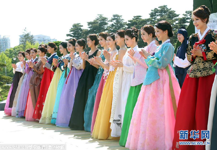 当地时间2015年5月20日,韩国首尔,来自大邱地区的韩国小姐候选人担任模特走秀,展示色彩各异的传统韩服。东方IC