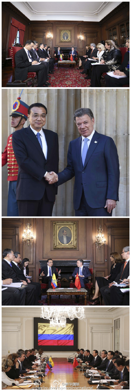 新华网北京5月22日电 据新华社“新国际”微博报道,当地时间21日下午,李克强总理在总统府与哥伦比亚总统桑托斯举行会谈时说,中哥经济互补性强,合作前景广阔,中方愿同哥方扩大相互投资,推进产业对接。会后,两国领导人见证了产能、基础设施、金融、教育文化等一系列合作协议的签署。