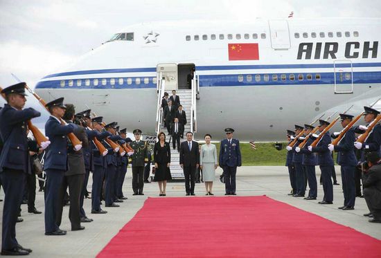 哥伦比亚外交部长奥尔古因和中国驻哥伦比亚大使汪晓源到机场迎接。哥空军仪仗队在红地毯两侧列队,军乐队奏响进行曲,向李克强总理夫妇致敬。
