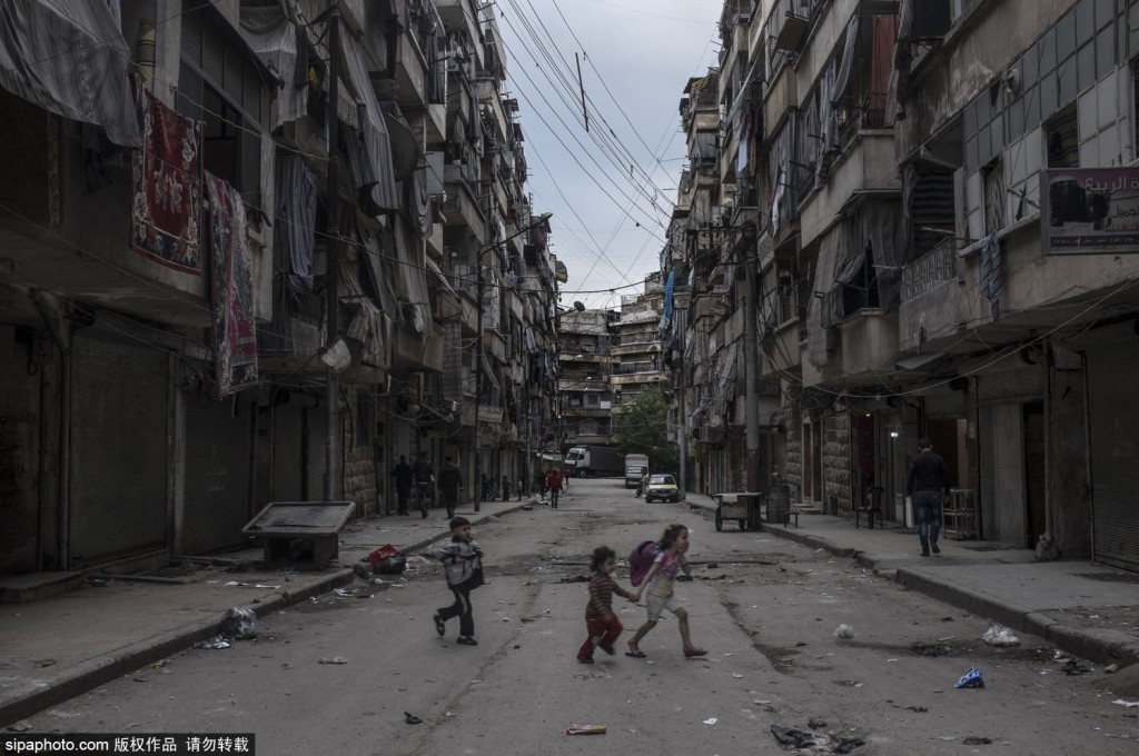 当地时间2015年5月讯,叙利亚阿勒颇,阿勒颇是叙利亚的一座历史名城,有很多古迹,曾经也是重要的旅游目的地。然而战争的摧残使这里很难再看到游客身影,随处可见的是残破空旷的房屋和街道,没有明亮的色彩,裸露的钢筋水泥“碎片”让整个城市变得灰暗无比。阿萨德政权还在继续轰炸叛军控制的地区,废弃的公交车被横在路口变成了一堵临时墙壁阻挡狙击手。(图片来源:SIPA)