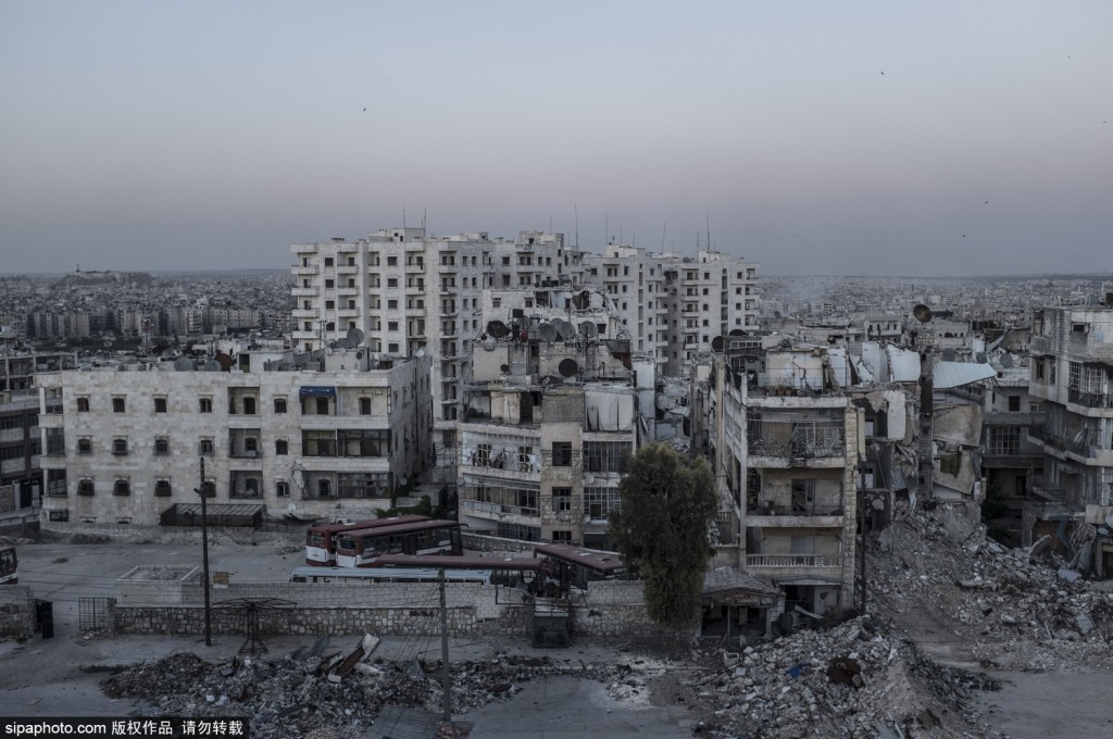 当地时间2015年5月讯,叙利亚阿勒颇,阿勒颇是叙利亚的一座历史名城,有很多古迹,曾经也是重要的旅游目的地。然而战争的摧残使这里很难再看到游客身影,随处可见的是残破空旷的房屋和街道,没有明亮的色彩,裸露的钢筋水泥“碎片”让整个城市变得灰暗无比。阿萨德政权还在继续轰炸叛军控制的地区,废弃的公交车被横在路口变成了一堵临时墙壁阻挡狙击手。(图片来源:SIPA)