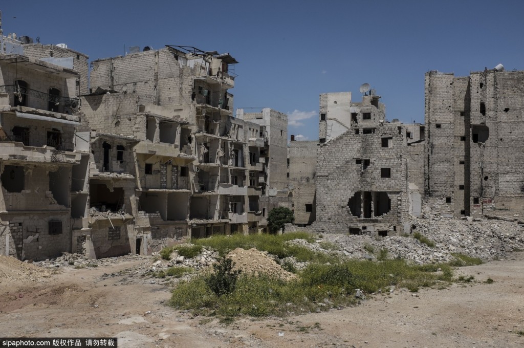 当地时间2015年5月讯,叙利亚阿勒颇,阿勒颇是叙利亚的一座历史名城,有很多古迹,曾经也是重要的旅游目的地。然而战争的摧残使这里很难再看到游客身影,随处可见的是残破空旷的房屋和街道,没有明亮的色彩,裸露的钢筋水泥“碎片”让整个城市变得灰暗无比。阿萨德政权还在继续轰炸叛军控制的地区,废弃的公交车被横在路口变成了一堵临时墙壁阻挡狙击手。(图片来源:SIPA)