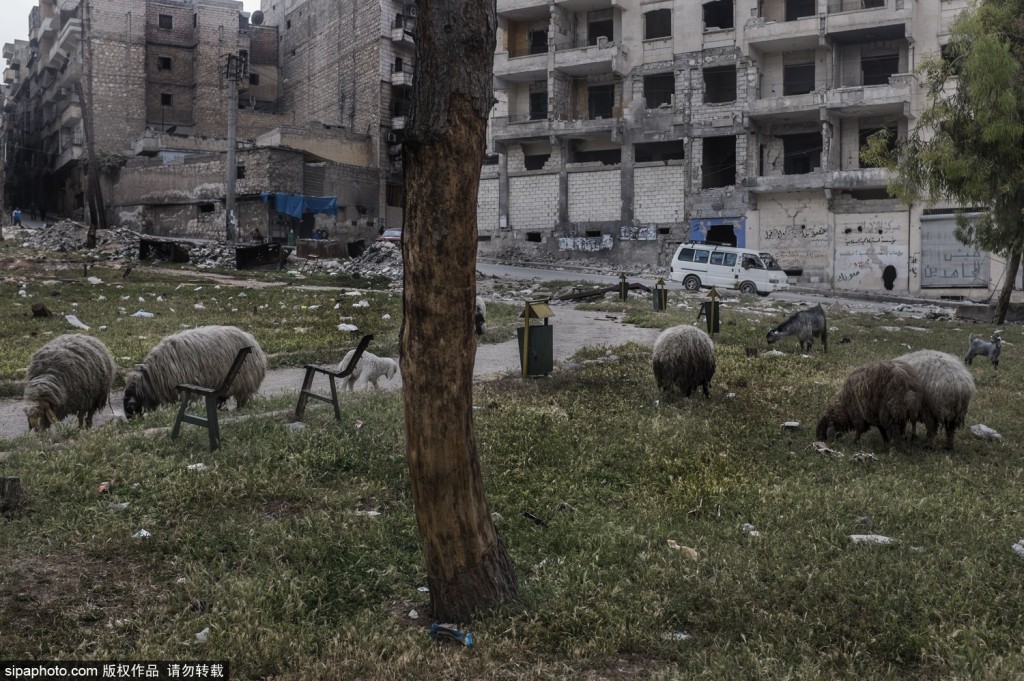 当地时间2015年5月讯,叙利亚阿勒颇,阿勒颇是叙利亚的一座历史名城,有很多古迹,曾经也是重要的旅游目的地。然而战争的摧残使这里很难再看到游客身影,随处可见的是残破空旷的房屋和街道,没有明亮的色彩,裸露的钢筋水泥“碎片”让整个城市变得灰暗无比。阿萨德政权还在继续轰炸叛军控制的地区,废弃的公交车被横在路口变成了一堵临时墙壁阻挡狙击手。(图片来源:SIPA)