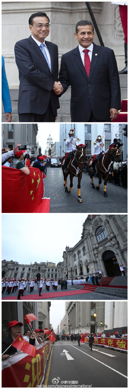 新华网北京5月23日电 据新华社“新华国际”微博报道,当地时间22日下午,秘鲁总统府前广场举行盛大仪式,欢迎中国总理到访。在身着盛装的骑兵卫队护送下,李克强总理专车缓缓驶入广场。伴着雄壮的军乐,李克强总理走上红地毯,检阅仪仗队。当《义勇军进行曲》奏响时,秘鲁仪仗队用中文高唱中国国歌。