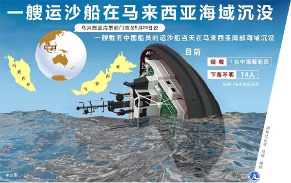 这艘玻利维亚籍运沙船20日在马来西亚柔佛州附近海域沉没,1名中国籍船员获救,14人下落不明,其中包括13名中国籍船员。