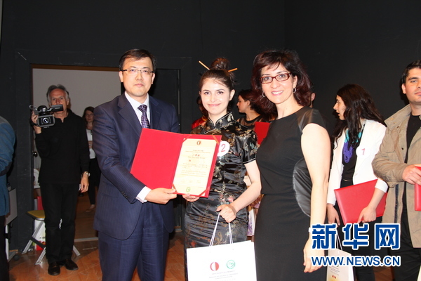 中国驻土耳其使馆张涛参赞及中东技术大学孔子学院土方院长娜芝丽为第二名获奖者颁奖(新华网记者 郑金发摄)
