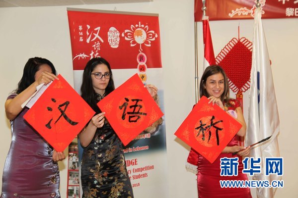 一选手现场表演汉语书法“汉语桥”。(新华社记者刘顺摄)