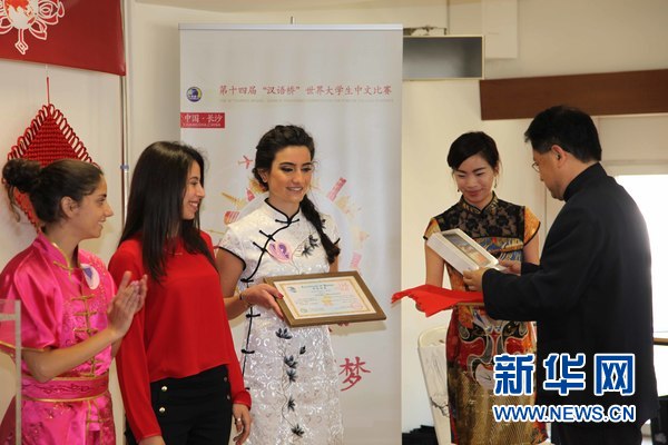 中国驻黎巴嫩大使姜江向第一名获得者颁发证书和奖品。(新华社记者刘顺摄)