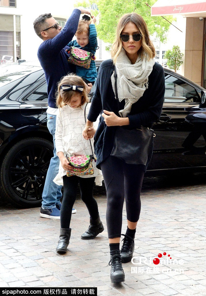 美国洛杉矶当地时间2015年5月24日,杰西卡·阿尔芭(Jessica Alba )一家现身洛杉矶比弗利山庄。小囧娃Honor Marie Warren和小女儿Haven Garner Warren纷纷现身。图片来源:Sipaphoto