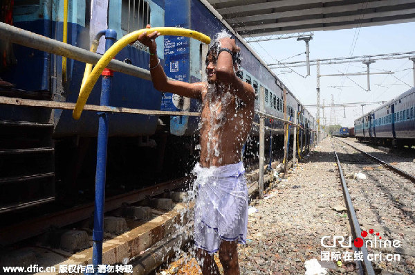 当地时间2015年5月24日,印度阿拉哈巴德,一名印度乘客用火车站的水管冲凉。图片来源:东方IC