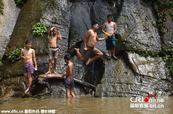 当地时间2015年5月23日,印度迪马普尔,青年人跳入水中避暑。图片来源:东方IC