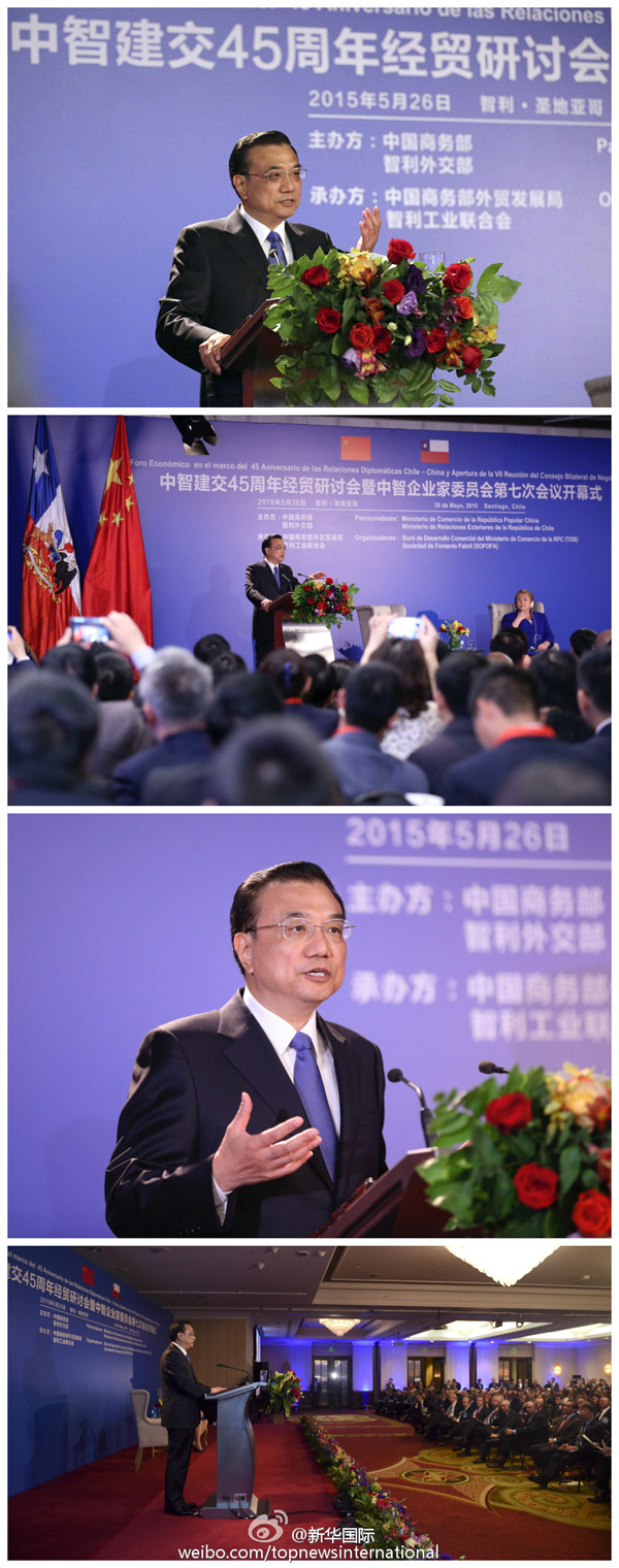 新华网北京5月28日电 据新华社“新华国际”微博报道,李克强26日在中智建交45周年经贸研讨会暨中智企业家委员会第七次会议上就中智合作提三点建议:持续扩大双边贸易规模;加强产业和投资合作;深化人文交流,分享社会治理经验。总理说中国青铜器制造曾誉满全球,智利铜产品举世闻名,希望铸就双方友谊的铜筋铁骨。