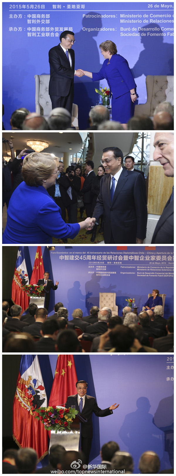 新华网北京5月28日电 据新华社“新华国际”微博报道,智利总统巴切莱特26日在纪念中智建交45周年会上盛赞中智多个“第一”:智利是南美第一与中国建交、拉美第一与中国签署自贸协定的国家,昨天又创造了第一次唱国歌的国宴,引发会心笑声。此前欢迎国宴遇音响故障放不出国歌,李克强当即提议清唱,为智总统化解难题。