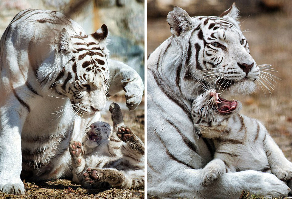 俄白虎幼崽撒娇卖萌 打扰虎妈休息遭咆哮(高清组图)