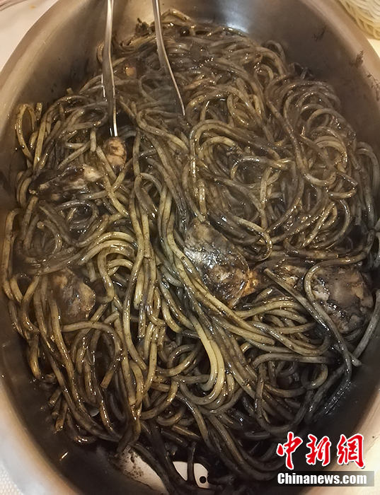 图为当地独具特色的墨鱼汁面。 中新网记者 李卿 摄