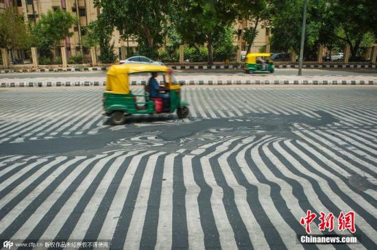 当地时间2015年5月28日,印度新德里,印度遭遇极端高温天气,导致路面柏油融化。图片来源:CFP视觉中国