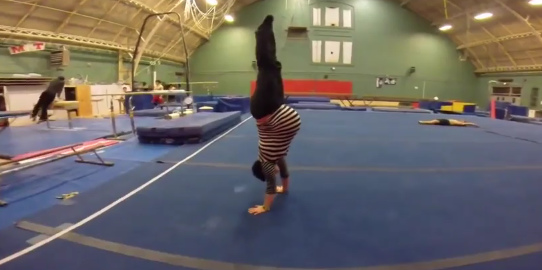 片中可见,夏普熟练地将双手按在双杠上,做引体向上,虽然肚子很大,但夏普的身手甚至比没怀孕的人更矫健。镜头一转,夏普在毋须任何人帮助下,一下子便做出凌空倒立动作,一路用手步行,非常厉害。