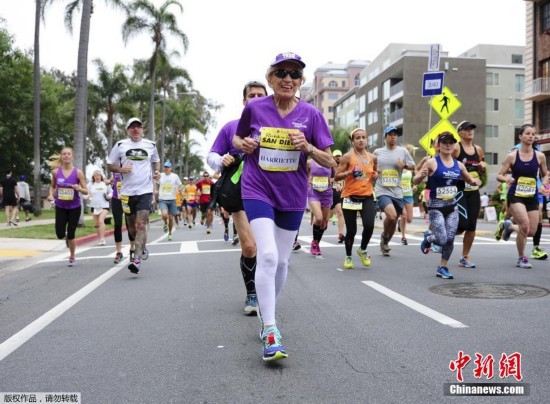 当地时间5月31日,92岁的哈丽雅特·汤普森(Harriette Thompson)参加在圣地亚哥举行的摇滚马拉松。以7小时24分36秒的时间跑完马拉松,改写女性马拉松完赛者最高龄纪录。