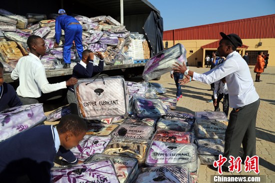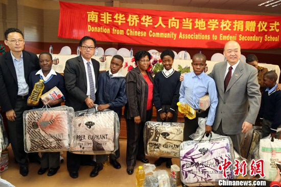 6月1日,中国驻约翰内斯堡总领馆与南非华侨华人举行捐赠活动,将价值近35万兰特(约合18万元人民币)的毛毯、书包、衣物及食品等捐赠给南非索韦托地区的艾穆德尼(Emdeni)高中的贫困学子们。 中新社发 宋方灿 摄