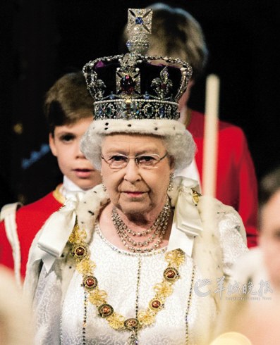 英女王上月在议会上佩戴的“帝国王冠”。该王冠在伦敦塔由“自耕农狱警”看守永久展出,特色在于镶嵌了不少有历史意义的珠宝,包括2868粒钻石、273颗珍珠、17枚蓝宝石、11颗祖母绿和5枚红宝石。