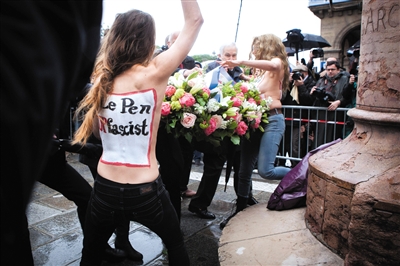 5月1日,法国极右翼政党国民阵线主席玛丽娜·勒庞“五一”在巴黎市中心演说时,3名“费曼”成员出现在旁边建筑阳台上,半裸示威,模仿纳粹敬礼,胸前写有“阻止法西斯”等标语,干扰勒庞的演说,随后被逮捕。