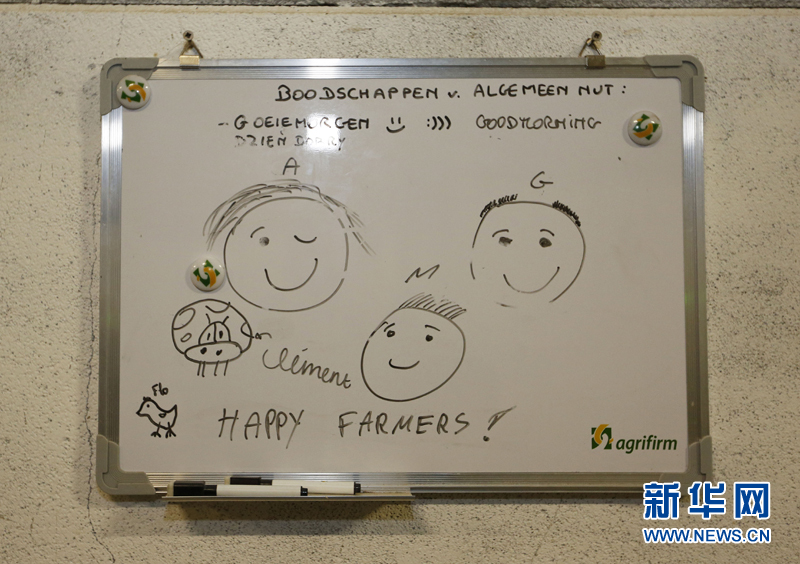 4月23日,在比利时古城根特附近一个小村庄的养鸡场,白板上画着爸爸、妈妈和一个小娃娃的头像,下面写着“开心的农夫!”新华社记者叶平凡摄
