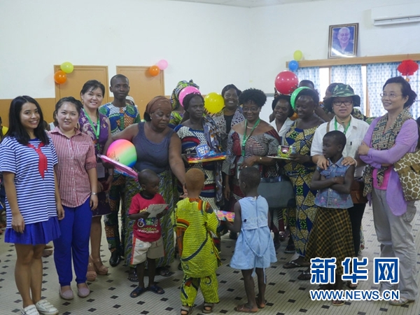 贝宁阿波美卡拉维大学孔子学院老师向SOS儿童村孩子们赠送玩具并合影。罗璐 摄