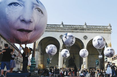 图片说明:5日,德国慕尼黑,示威者升起印有G7集团国家领导人头像的气球,抗议G7峰会召开。 东方IC