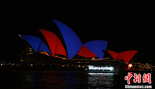 图为悉尼歌剧院当日晚在灯光节上的最后亮相。中新社发 赖海隆 摄
