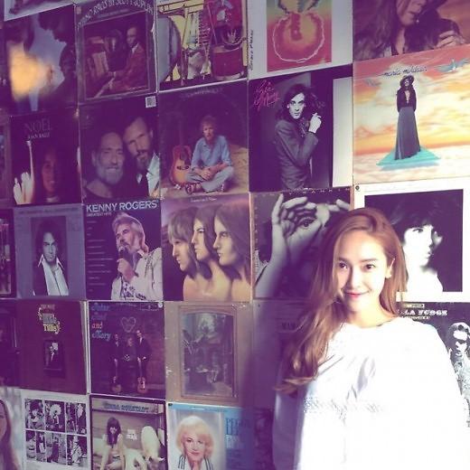 郑秀妍9日在Instagram上公开了一张照片,她微笑站在一面贴有各种专辑封面的墙边,清纯美貌引人关注。