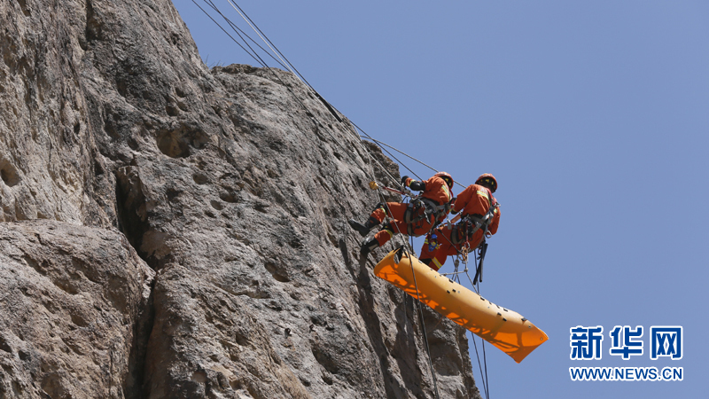 6月3日,代表中国参加上合组织国际救援联合演练的新疆消防总队队员在哈萨克斯坦阿拉木图州塔姆卡垒塔斯景区的哈内务部紧急情况委员会教练基地“岩石城-阿斯塔纳”参加演练。新华社记者沙达提摄
