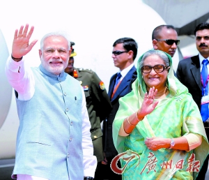 6日,在孟加拉国首都达卡,孟加拉国总理哈西娜(右)迎接莫迪。