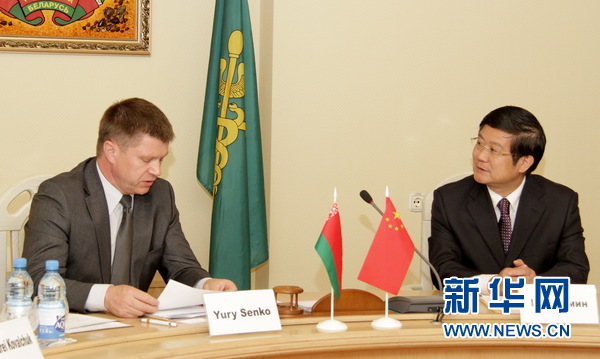 中国驻白俄罗斯大使崔启明(右)与白国家海关委员会主席尤里·先科举行会谈。新华社记者陈俊锋摄