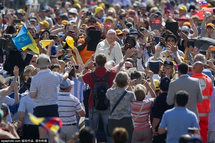 当地时间2015年6月10日,梵蒂冈,罗马教皇弗朗西斯在圣彼得广场会见教众举行弥撒。(图片来源:希帕中国)
