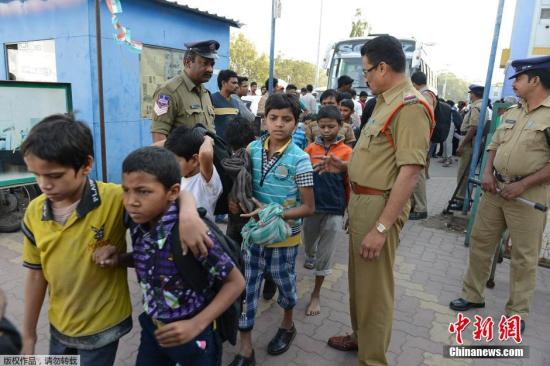 当地时间2015年2月5日,印度塞康德拉巴德,印度警方将解救的童工送上火车,返回家乡。近期共有约400名在手镯工厂工作的童工获救。
