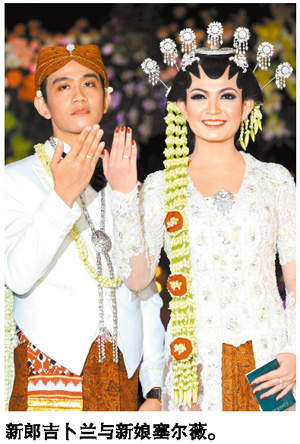 新华社电 印尼总统佐科·维多多的长子吉卜兰11日在老家梭罗市迎娶相恋多年的选美冠军塞尔薇·阿南达。婚礼从筹备到举办,“第一家庭”自己动手,不租酒店,不坐婚车,不铺张,不收礼。数千民众获邀参加婚礼,更显“佐科维”亲民作风。