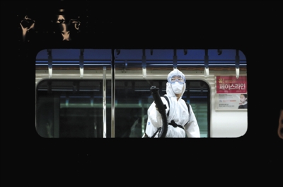 6月4日,韩国工人对铁路交通系统进行消毒。