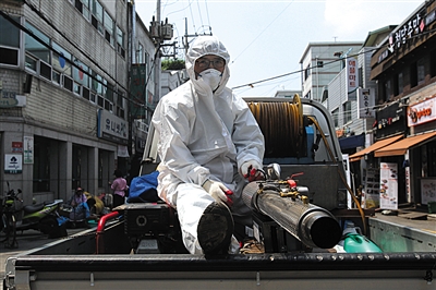 6月12日,韩国首尔,工人在街头喷洒消毒剂。
