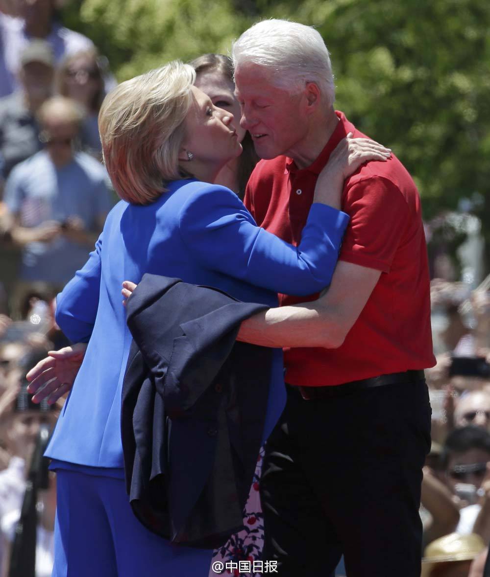 【希拉里在纽约展开首场竞选集会 丈夫出席助威并深情拥吻】参选美国总统的前国务卿希拉里·克林顿当地时间12日在纽约展开首场正式竞选集会,丈夫、前总统比尔·克林顿和女儿切尔西出席助威。希拉里首轮演讲改变竞选策略,努力将自己塑造为美国普通民众的代言人。