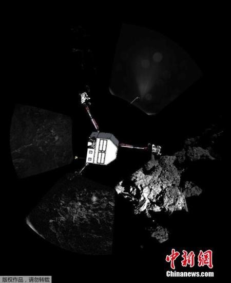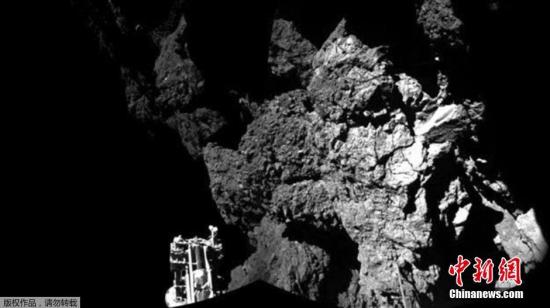 资料图:探测器“菲莱”在着陆木星族彗星67P/丘留莫夫-格拉西缅科彗星后拍摄的首张照片。“菲莱”是人类探测器首次软着陆彗星。虽然之后它在表面多次弹跳,不过最终稳定了下来。