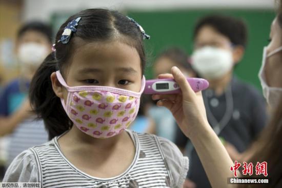 当地时间2015年6月8日,韩国保健福祉部通报,该国中东呼吸综合征(MERS)确诊病例当天新增23例,并有一名16岁少年被确诊患上中东呼吸综合征,这是韩国首次发现20岁以下的确诊病例。韩国未停课的学校,学生课前戴口罩测体温。