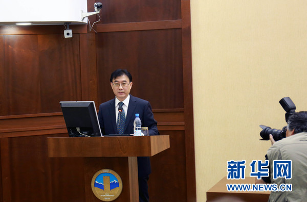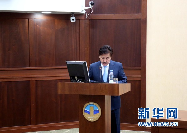 哈萨克斯坦法拉比国立大学校长穆塔诺夫在研讨会上发言(新华社记者 周良摄)