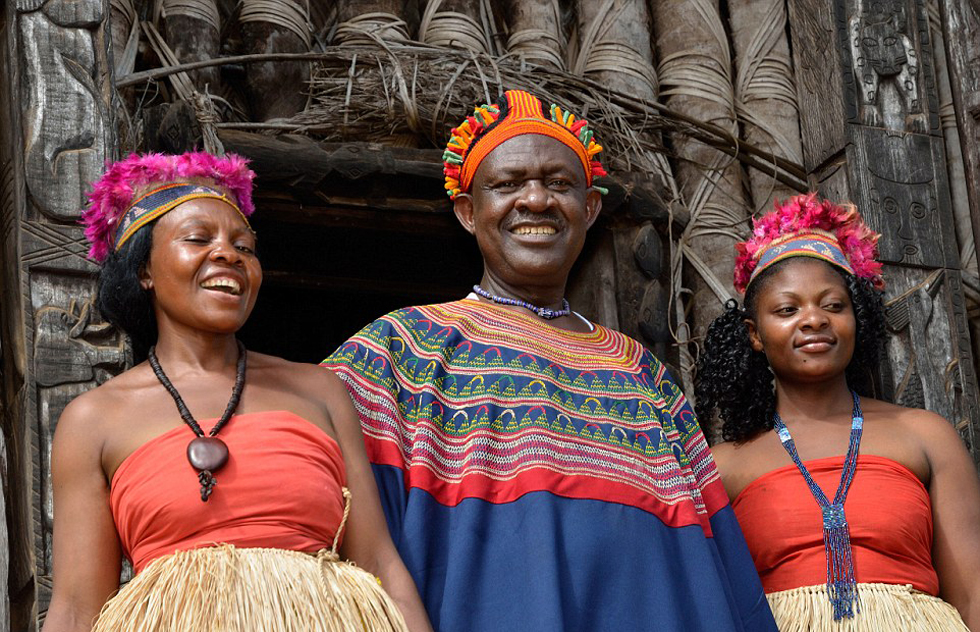 阿布比二世和他的两个“王后”。他是喀麦隆巴福特小镇的首领。(网页截图)