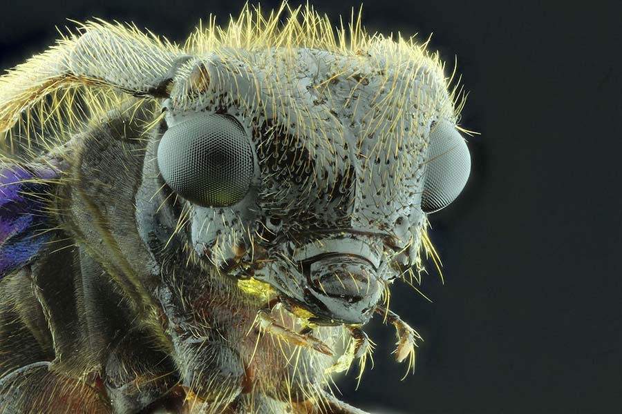这些照片中,既有八只眼睛的跳蛛(jumping spider),还有身上布满水滴的食虫虻(assassin fly)。罗伊姆说:“我在工作室里用常亮灯给一些昆虫拍了照片,同时在拍摄个别场景时用到了外接闪光灯。我喜欢在漆黑的森林里拍摄昆虫,因为有很多虫子可以在夜间发出惊人的光彩。”