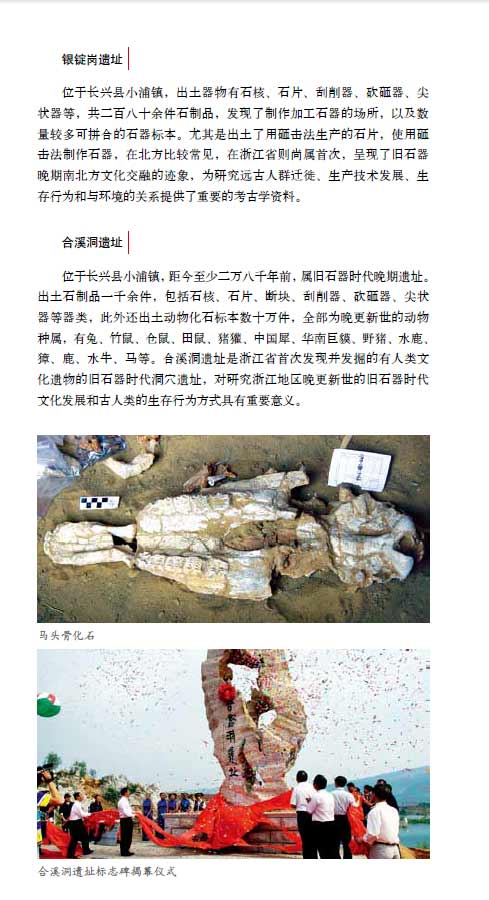 位于长兴县小浦镇,出土器物有石核、石片、刮削器、砍砸器、尖状器等,共二百八十余件石制品,发现了制作加工石器的场所,以及数量较多可拼合的石器标本。尤其是出土了用砸击法生产的石片,使用砸击法制作石器,在北方比较常见,在浙江省则尚属首次,呈现了旧石器晚期南北方文化交融的迹象,为研究远古人群迁徙、生产技术发展、生存行为和与环境的关系提供了重要的考古学资料。